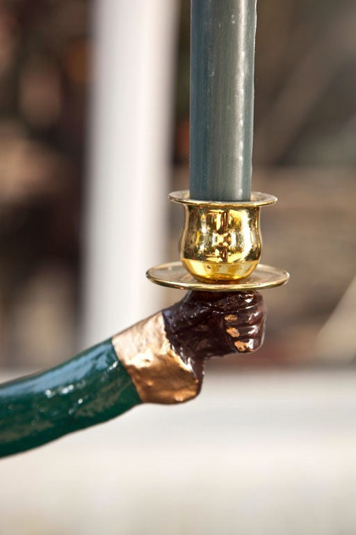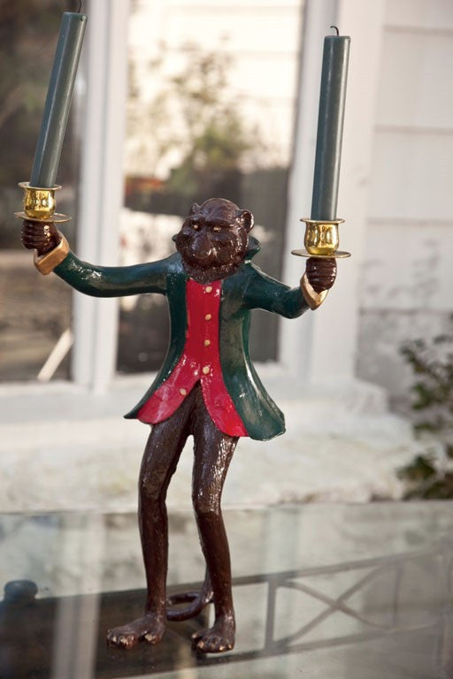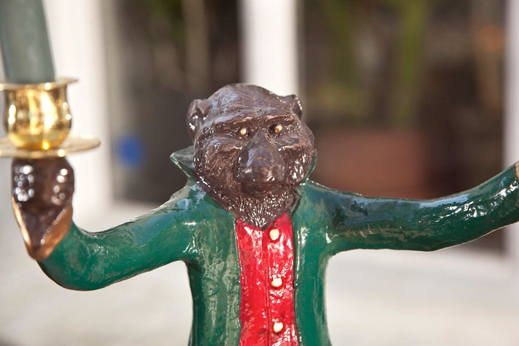 Pair of monkey - style Louis XV reproduction of candlesticks used in court of Louis XV. Brown monkeys with green and red coats. Gilt trim. Cast resin with paint. Made in the USA circa 1960. Condition: Excellent. 17”H x 12”D x 12”W. Height is to the top of the candleholder.