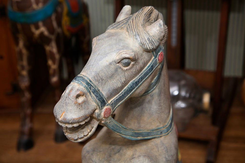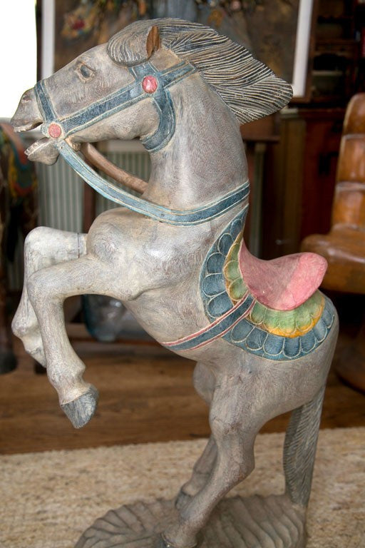 Carved wood statue of a standing horse decorated as a carnival type fixture in miniature. Painted grey background. Made in the USA circa 1930. Condition: Good. 34”H x 20”W x 8”D