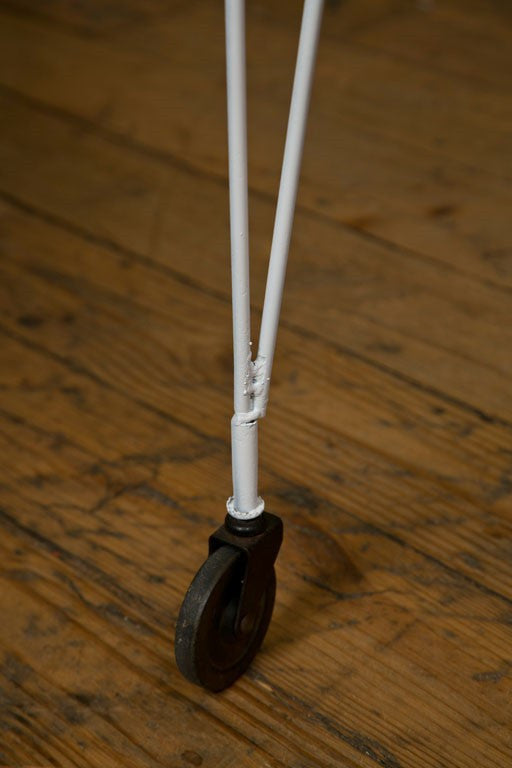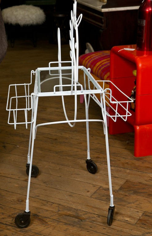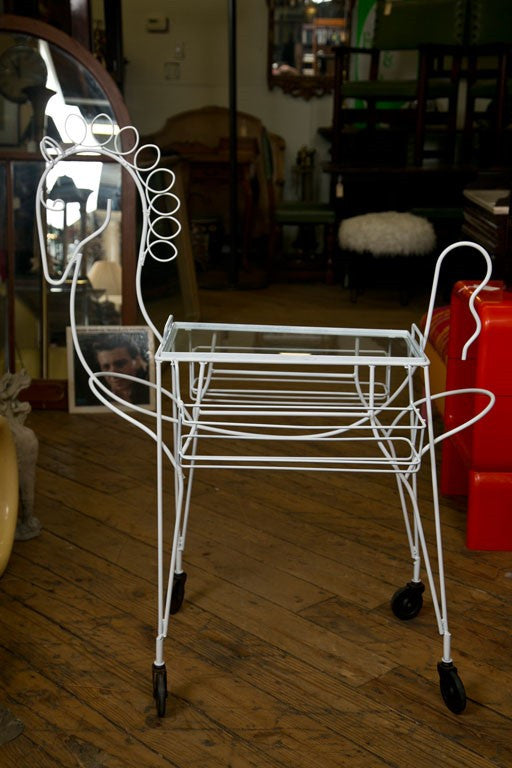 Wheeling horse finished in white lacquer on wire. Top is a removable grass tray for serving. Sides are bottle or glass holders. A unique style piece. Made in the USA circa 1950. Condition: Very Good. 41"H x 36"W x 23"D, Tray 26"H