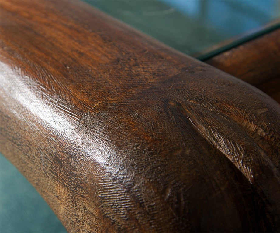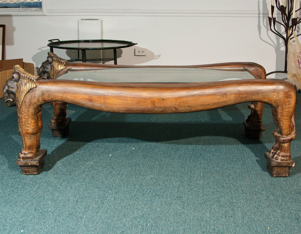 Based upon King Tut’s bed from the Metropolitan Museum of Art ( NY ) exhibit in 1970. Barrett had the great furniture designer Terry Slade create a cocktail table. Carved in poplar wood with an insert of glass, finished in antiqued walnut color with gilt and pumice trim. Hand carved. Made in the USA circa 1970s. Condition: Very Good. 21”H x 54”W x 30”D