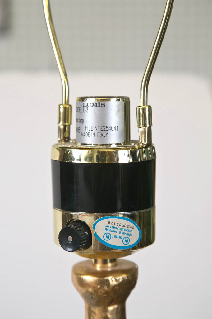 Wrought Iron which as been gold leafed. Made In Italy. Somewhat in the style of Alberto Giacometti. It is electrified in new type socket for all U.S. bulbs and currents. Made by Lumis. Priced as a pair without shades. May be purchased singly, more available. $1150 each. Made in Italy circa 1980. Condition: Excellent. 65"H x 13"D x 13"W