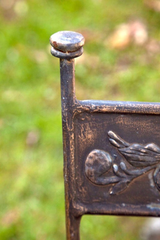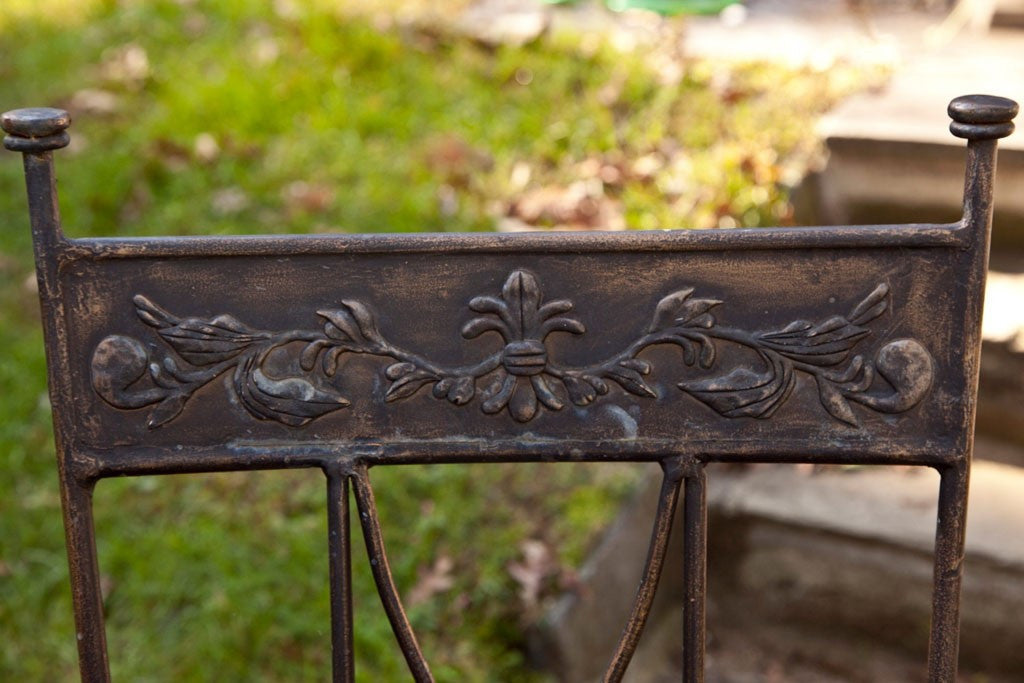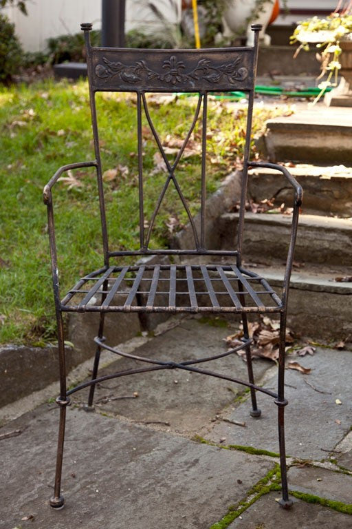 Handmade and hammered set of 5 armchairs, applied overlay on top of back. Straps of iron for seats, worn paint finish. Companion dining table available #G42008 for $900. Made in the USA circa 1940. Condition: Good. 38”H x 18”D x 20”W/L, S/H: 18”
