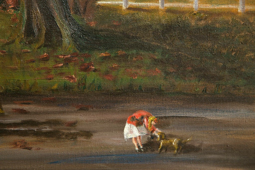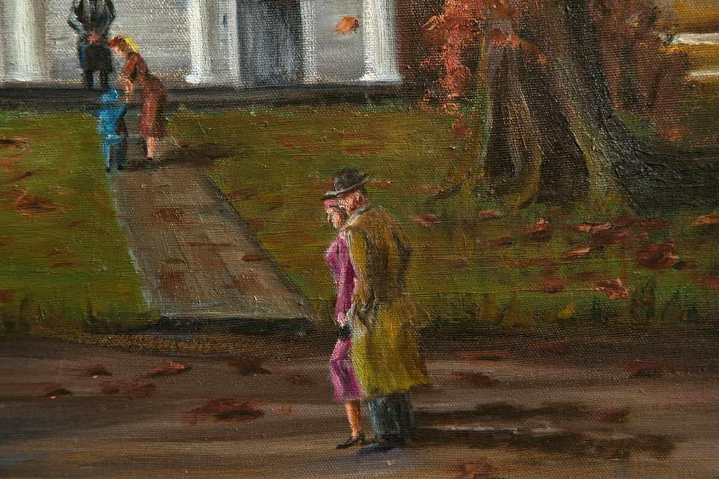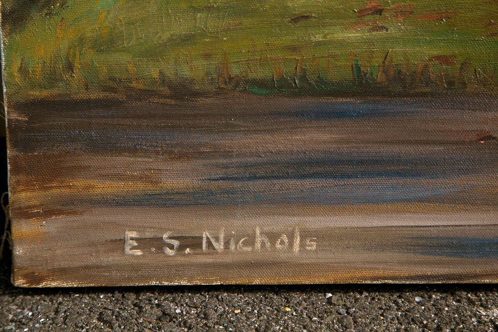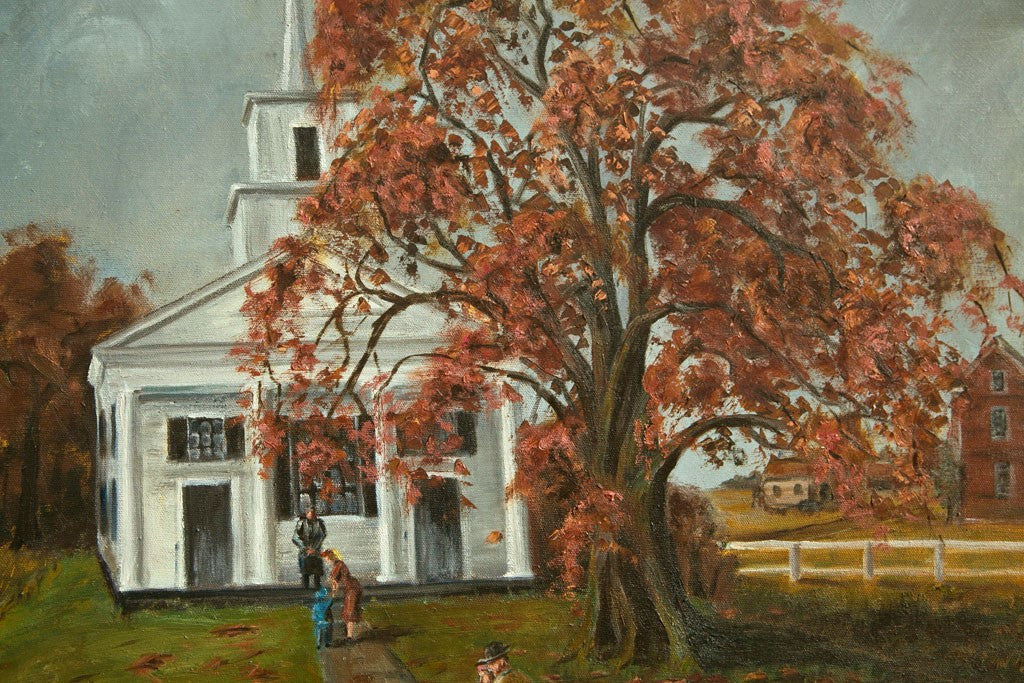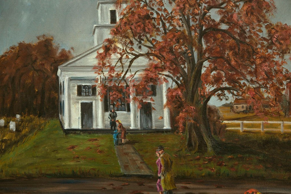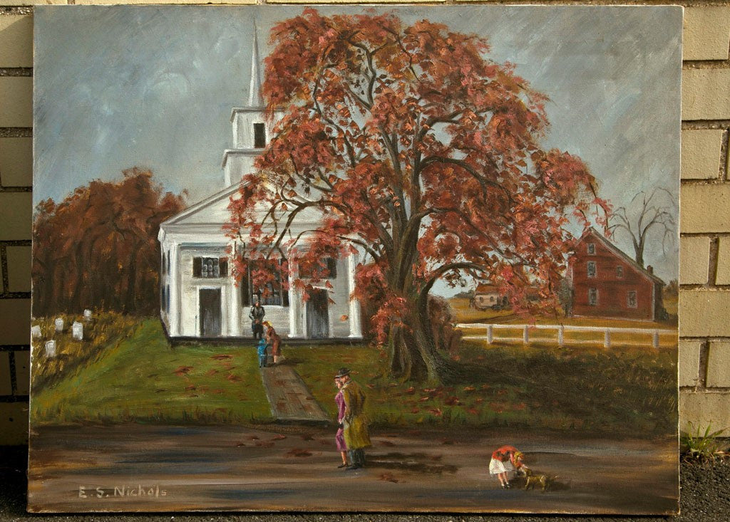 Oil on canvas. "Country Church." People going to attend church services in the fall season. Artist is E. S. Nichols, a New England ( USA ) impressionist artist. Stretched canvas over frame. Painted in the USA circa 1960. Condition: Excellent. 22”H x 28”W
