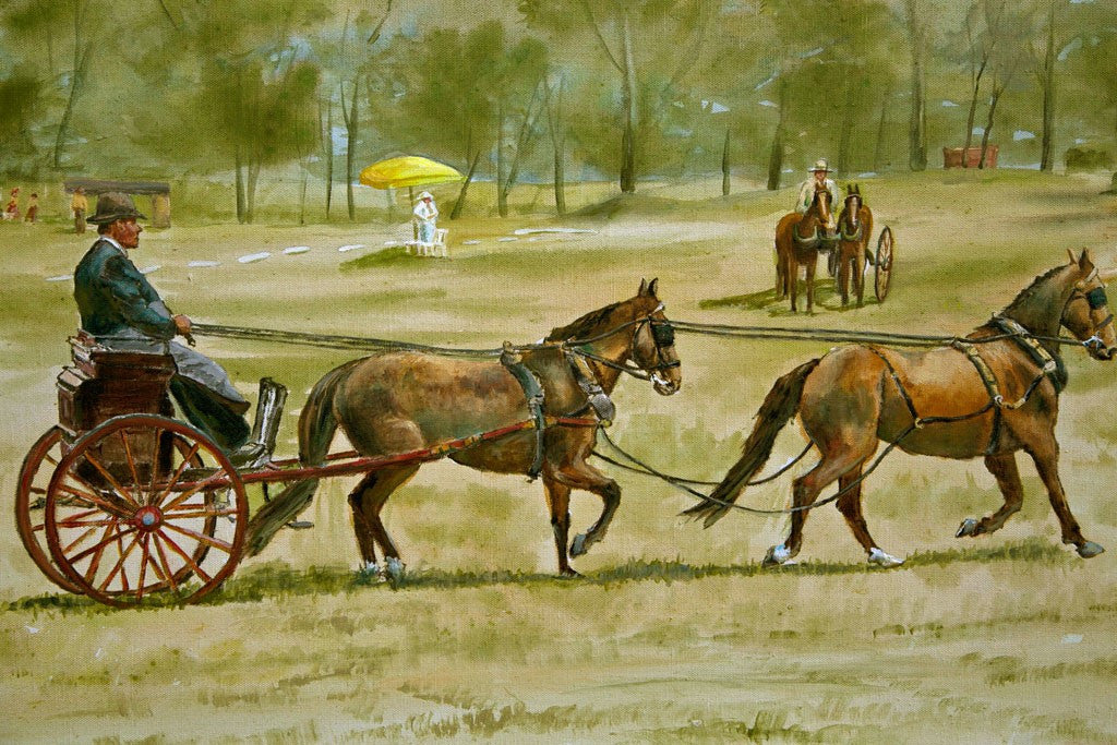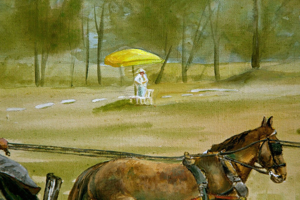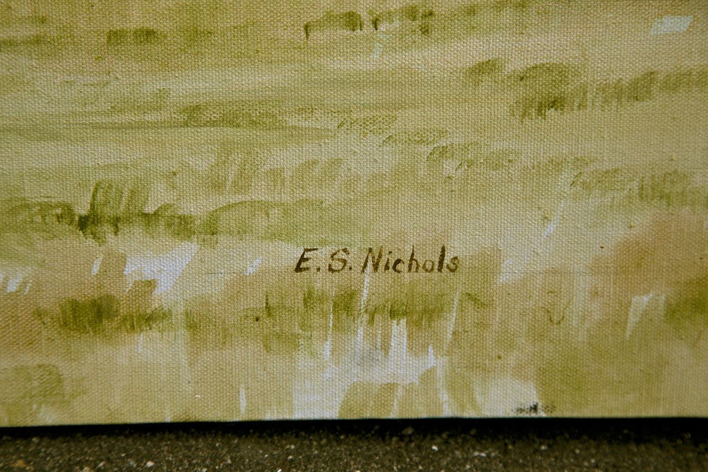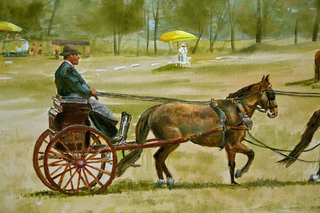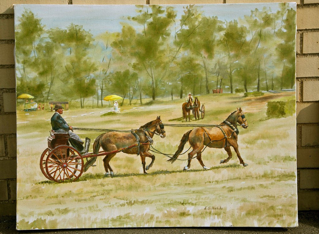 Oil on canvas. "19th century horse and buggy in park." Artist is E. S. Nichols, a New England ( USA ) impressionist artist. Stretched canvas over frame. Painted in the USA circa 1960. Condition: Excellent. 24”H x 30”W