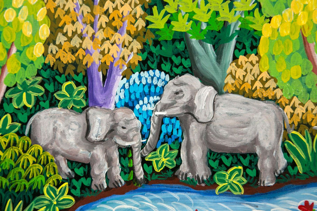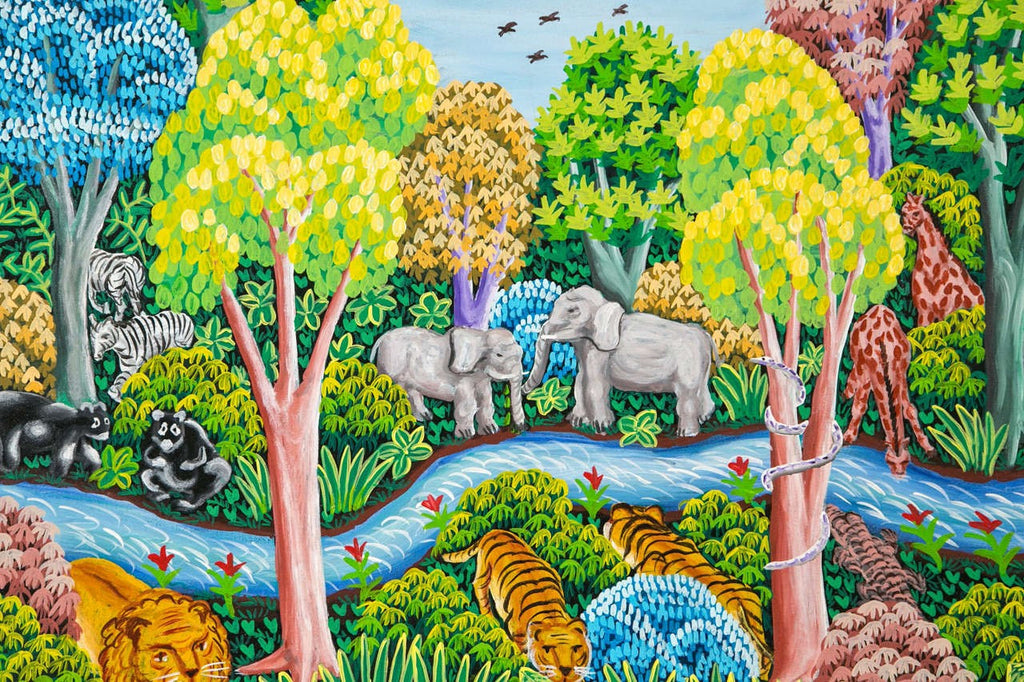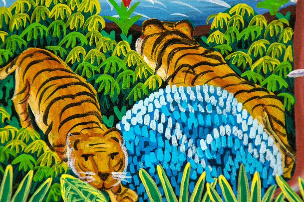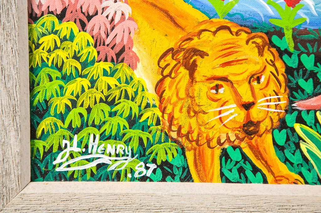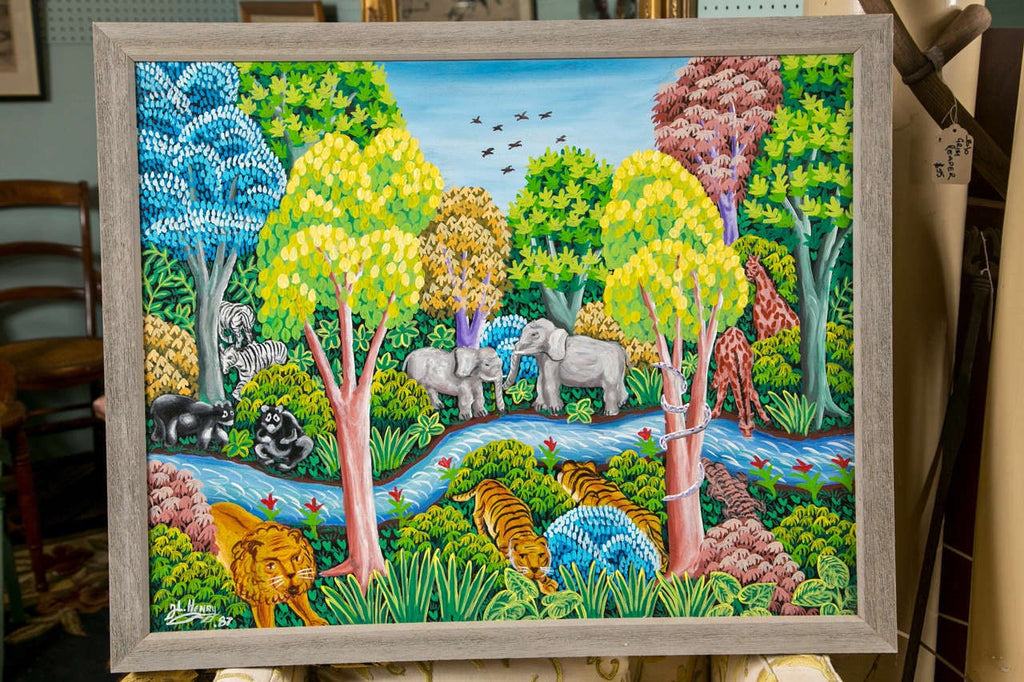 This could be the "Garden Of Eden." It has 8 birds, 8 trees, and animals in pairs. There is a stream running throughout painting. The artist has painted in a folk manner. The oil painting is on board. It is signed J.M. Henry '87. The frame is a grey stained oak wood. Painted in the USA. Condition: Excellent. 27”H x 32”W