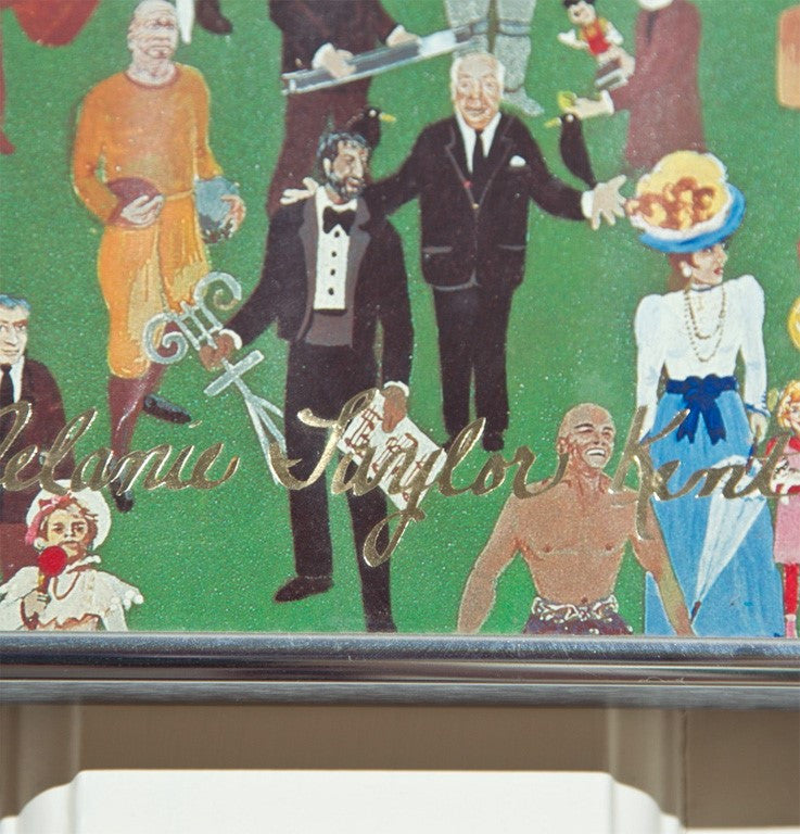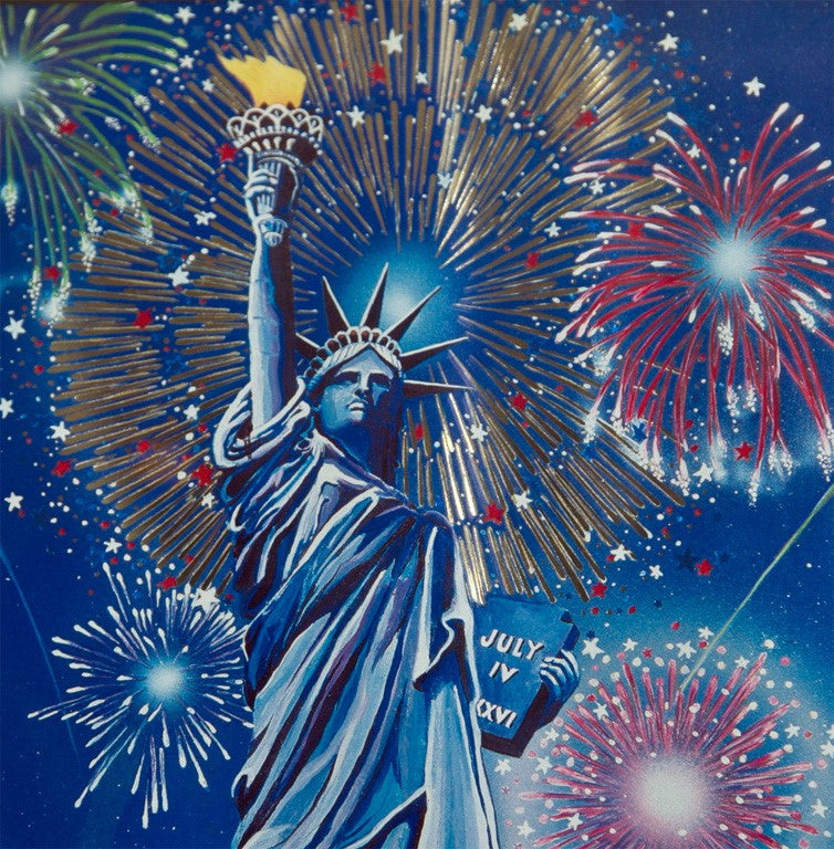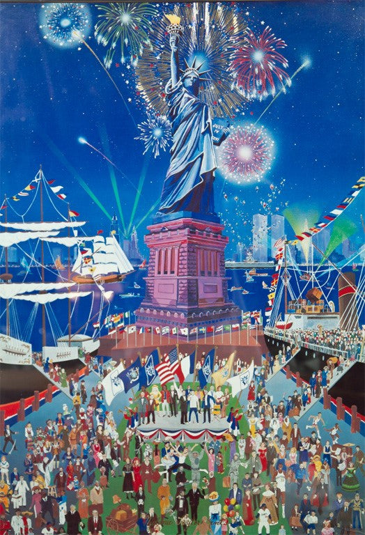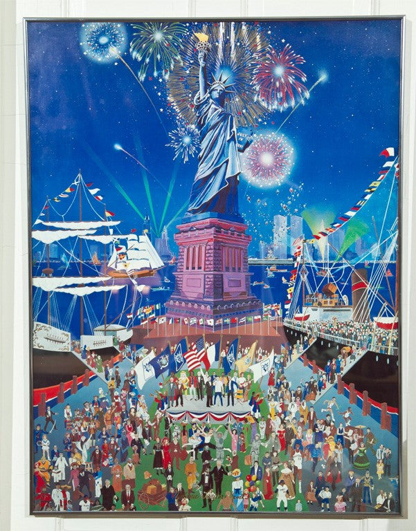 Melanie Taylor Kent is a California artist who specializes in serigraphs of events. This is the July 4,1986 Statue of Liberty centennial. There are 100 identifiable people in the print whose ancestors’ immigrated to America. Signed in gilt at bottom. Painted in the USA in 1986. Condition: Good. 34”H x 25”W