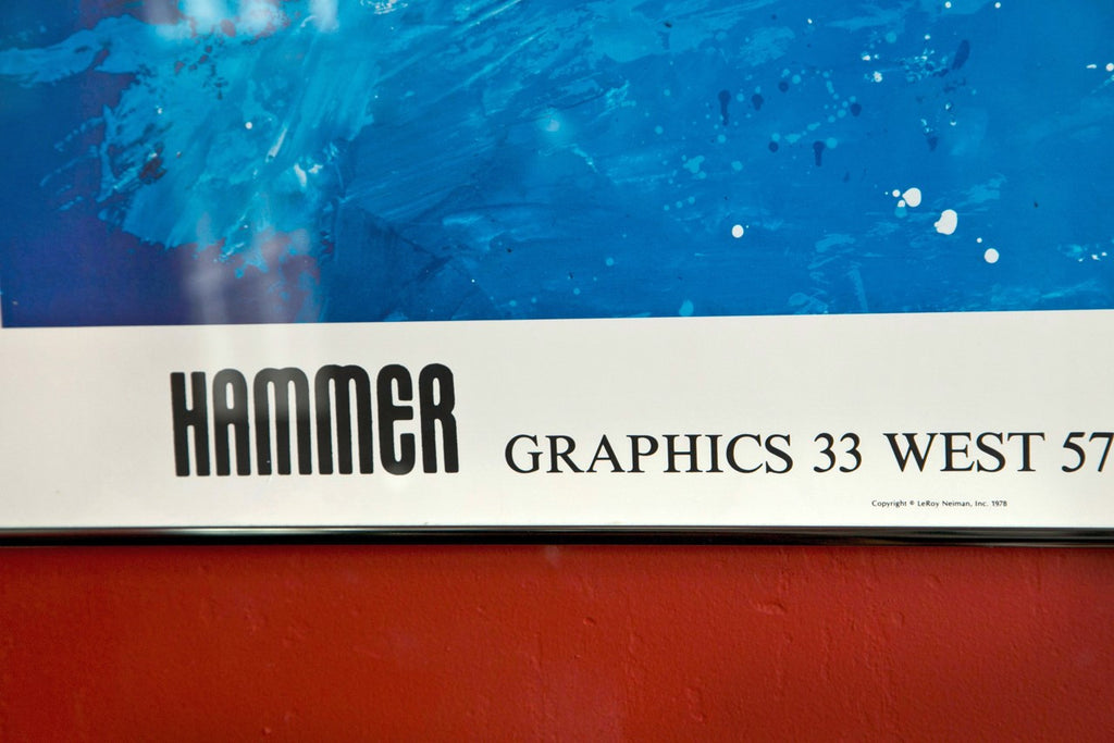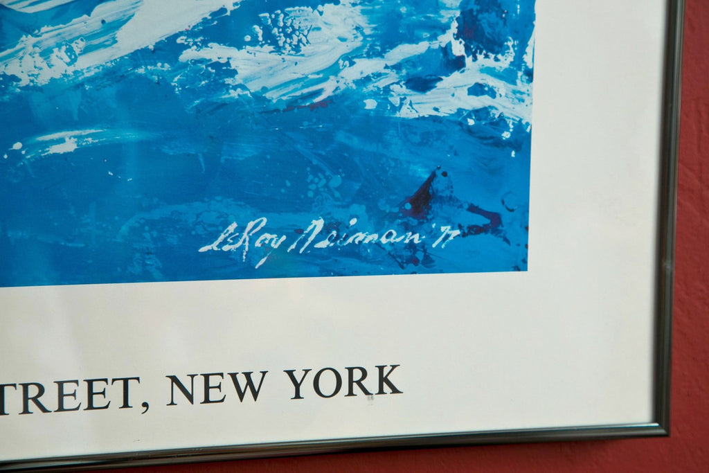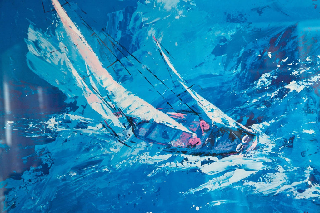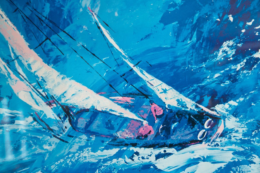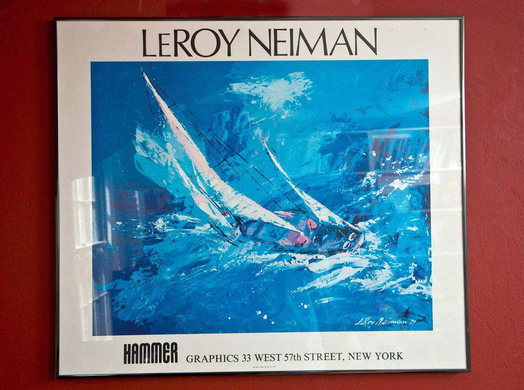 Blue colored print depicting a sailboat racing with waves. LeRoy Neiman was one of the greatest sports artists of the 20th Century. Printed by Hammer Galleries, 33 West 57 Street, New York City, circa 1976. Condition: Excellent. 26.5”H x 2”D x 30.5”W