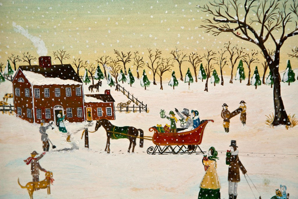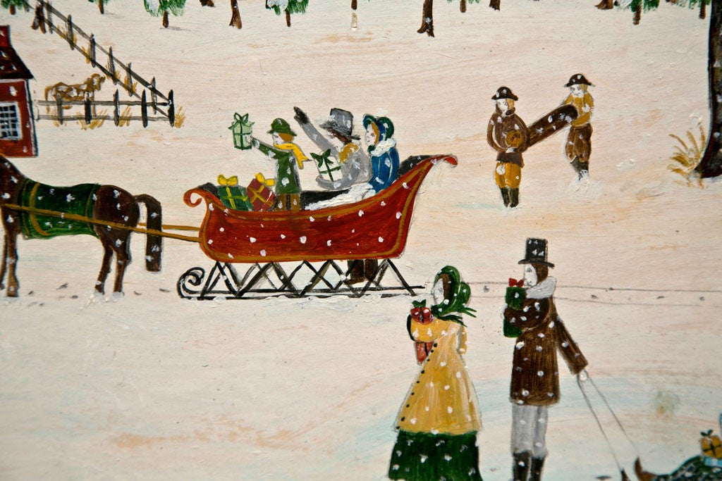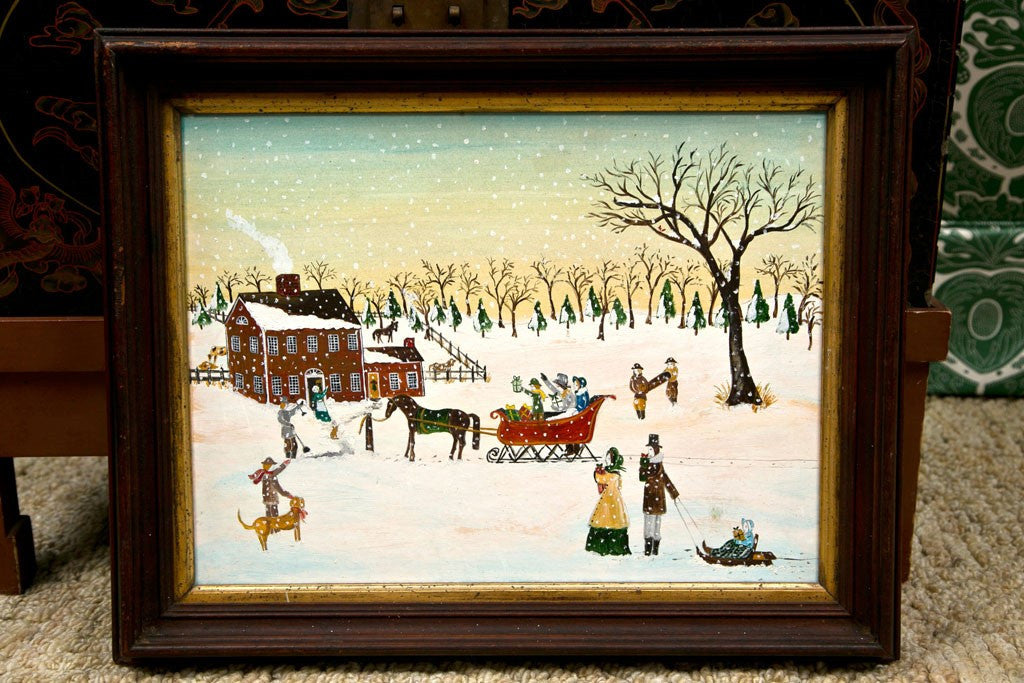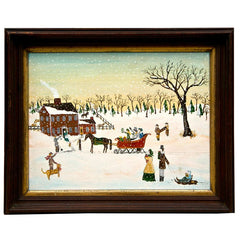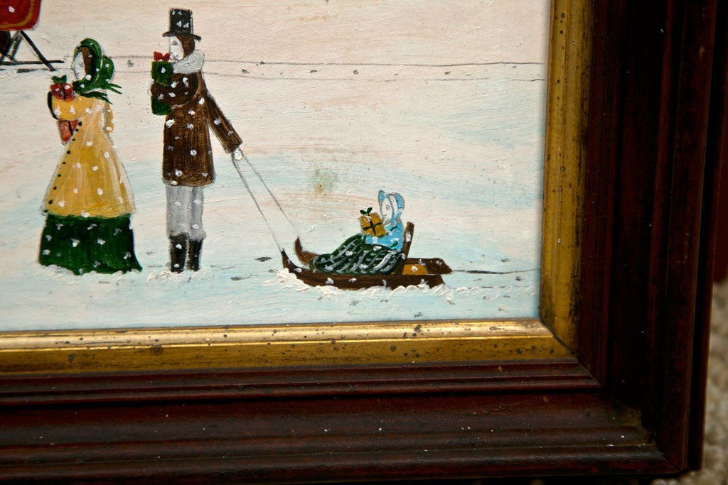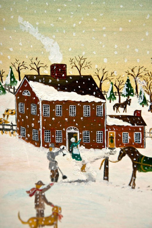 Christmas during snow storm at a 19th century farm. Sleds, house, people and animals. Oil on board attributed to Jane B. Bradley, a Member, Silvermine Artists Association ( New Canaan, Connecticut ). Painted circa 1950. 16”H x 20”W