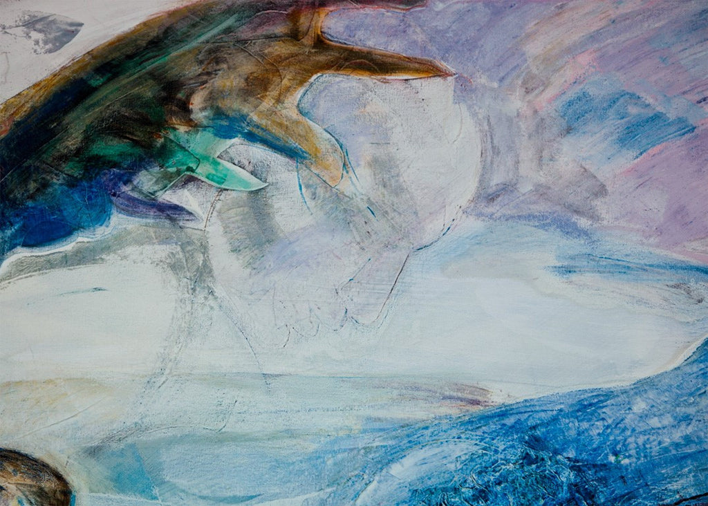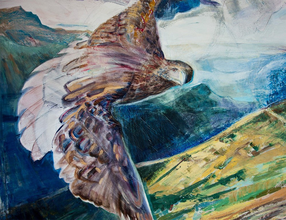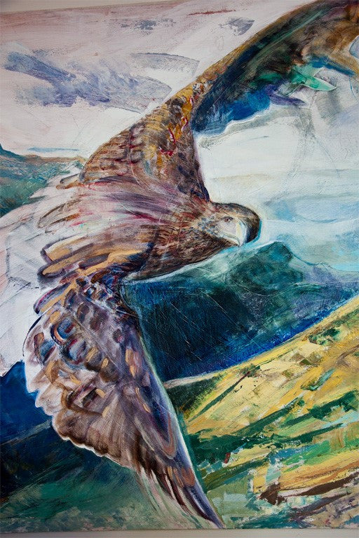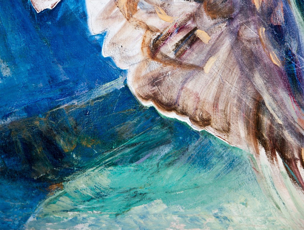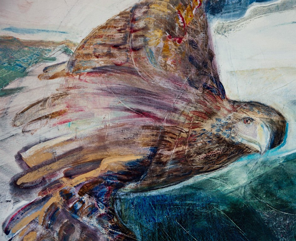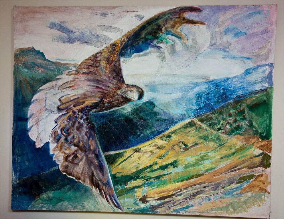 Unframed oil on canvas. Eagle soaring impressionist painting. A large painting. The artist is french and the painting was done in France. Work of the artists have been displayed in galleries in New York City. Made in France circa 1990. Condition: Very Good. 54"H x 67"W