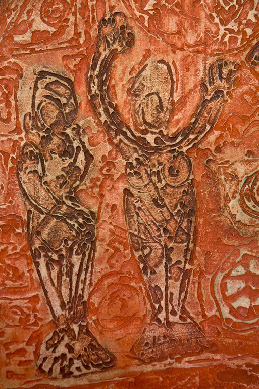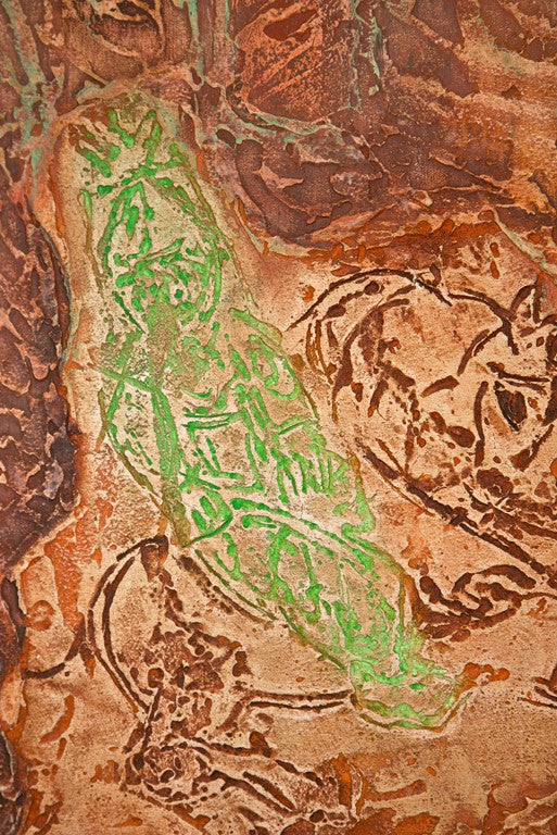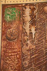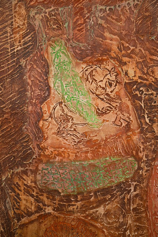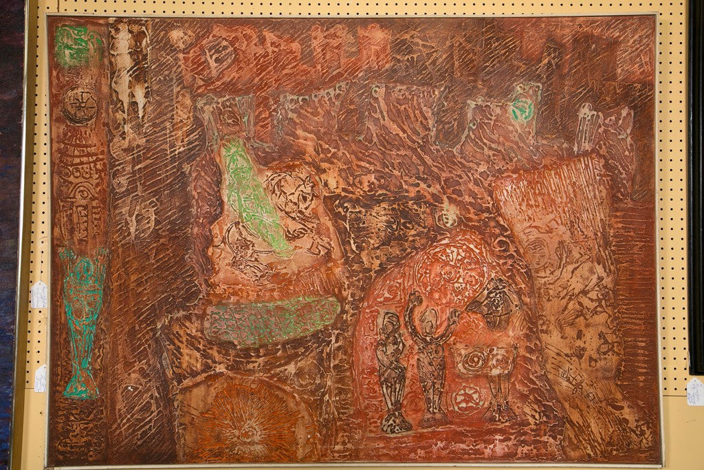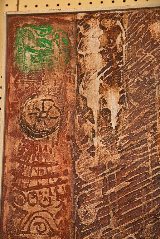 Famed Pittsburgh Artist. Painted this textured abstract painting in 1967. She was born in Egypt and has lived and worked in Pittsburgh for more than 40 years, Fifty seven of her paintings were exhibited in 2012 at the Andy Warhol Museum in Pittsburgh. Her art is in major private and corporate collections as well as many museums. She still paints at 89. She uses acrylic on canvas. She says "A painting should have feelings first, then composition.. .space and color. These are the four important elements." Made in the United States in 1967. Condition: Excellent. Acrylic on canvas. 49"H x 61"W x 2"D