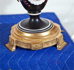 PAIR OF FRENCH HAND PAINTED "OLD PARIS" PORCELAIN LAMPS. CONVERTED OIL LAMPS- OLD PLEATED SHADES- DETAILED METAL BASES-AND ARMS - ALL DESIGNS ARE DIFFERENT- 9" BASE. Made in France circa 1850 of porcelain and brass. 30" H x 10.5" W x 17" D. Condition: Good ( except the shades ).