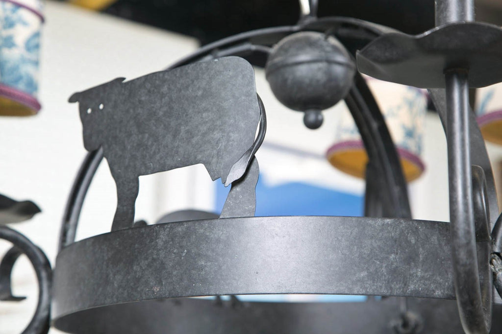 Round chandelier has three sets of double lights with shades. Entire chandelier is wrought iron, and painted black. In between the lights are 3 figures: a rooster; a cow; and a pig; they are all forged in iron. The shades are not in good condition. Made in the USA. Condition: Good.