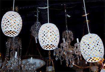 SET OF 3 HANGING CERAMIC LAMPS - HANGING ON CORD- CAN BE HUNG AT ANY HEIGHT. WE WILL SELL ALL 3 AT THE LISTED PRICE OR INDIVIDUALLY FOR $700 EACH. THE LIGHTS WERE MANUFACTURED IN THE USA CIRCA 1960S. EACH LIGHT IS 10"H X 8"DIA