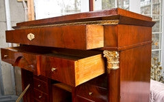 Flame Mahogany wood. It has a fully fitted interior flanked by Corinthian columns and with secret drawers. It was made in Paris between 1860 and 1880. The writing surface is 31" from the floor and is covered in a red wine color felt. The hand chased hardware is finished in dore. Hardware is original. Drawers are hand dove