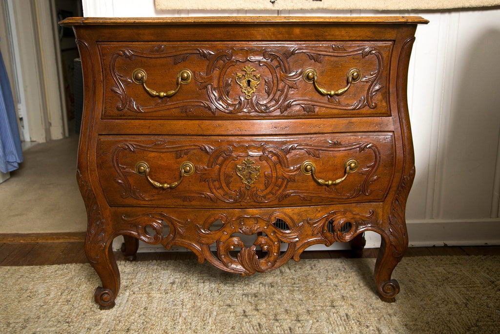 Made by Don Ruseau's New York factory in the 1940's, this hand made exact reproduction commode is perfect in its details. All of the craftsmen in that factory were French as well as the walnut wood which was imported from France before WWII. This is one of the finest pieces of French furniture ever made. Hand dove tail and oak drawers. Drawers are lined with blue and white wallpaper. Condition: Excellent. 30”H x 18.5”D x 37”W