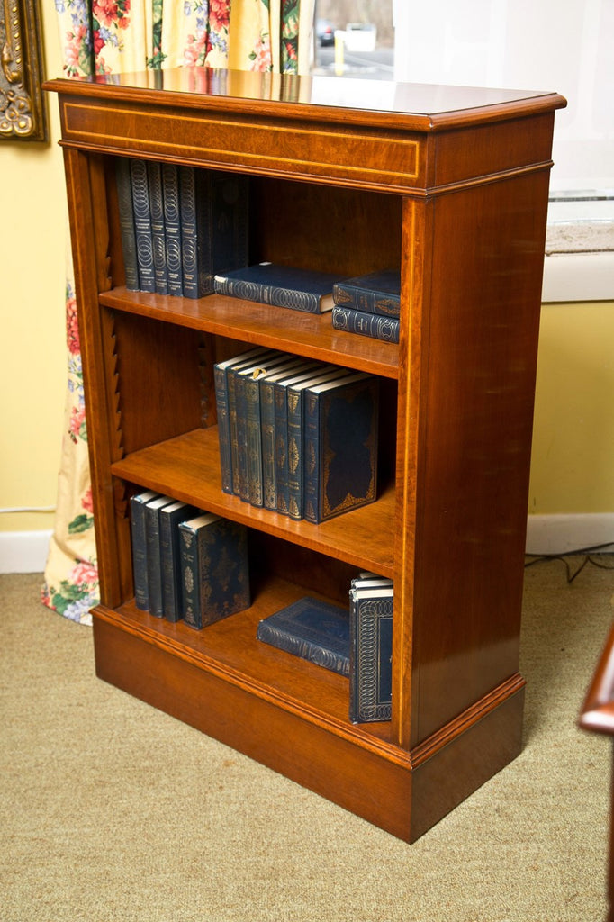 40" high bookcase in English Myrtle Burl. 3 shelves ( 2 adjustable ). Boxwood inlays on top, apron and front. Shelves are adjustable with ratchet side supports. We can supply multiples of this bookcase. Made in England circa 2010. Condition: Excellent. 40"H x 12"D x 40"W