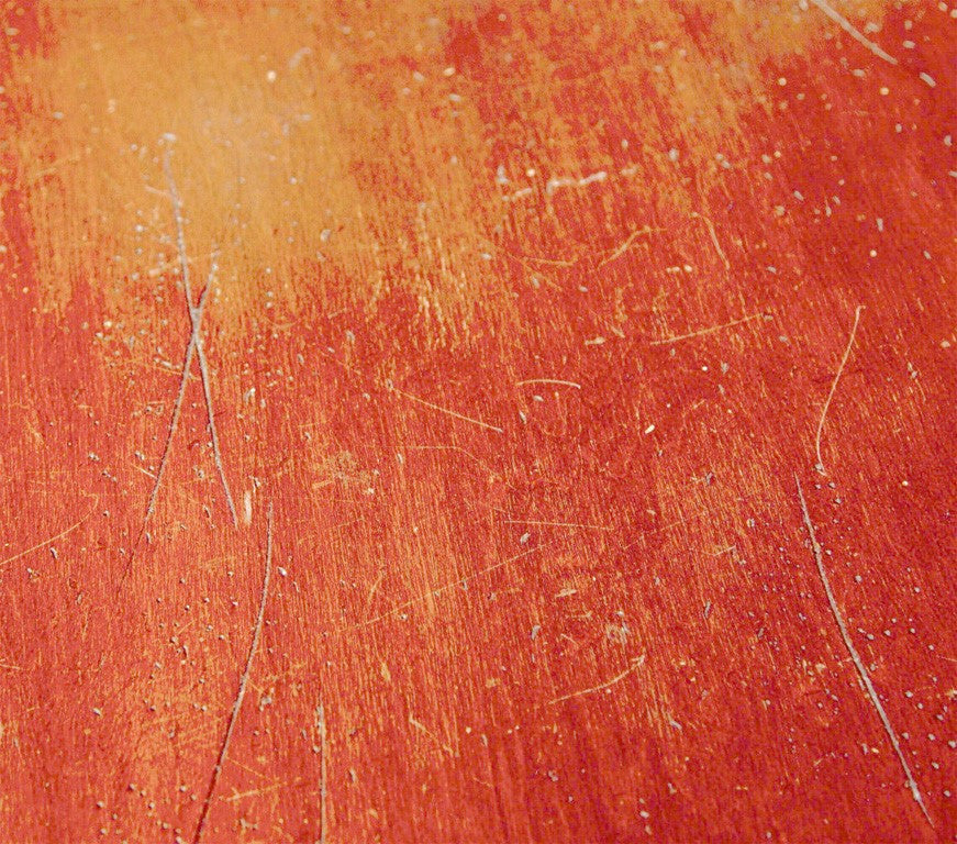 Writing table in birch wood with a small raised shelf on the back. Drawer in the apron with ball pull in brass. Large dowel heads over legs. Made in the USA circa 1960. Condition: Good; a few scratches on top surface ( may be part or the distressing ). 30”W x 24”D x 34”H