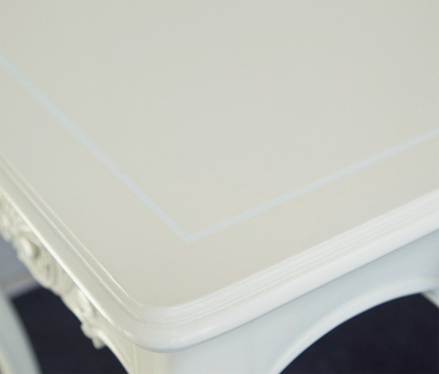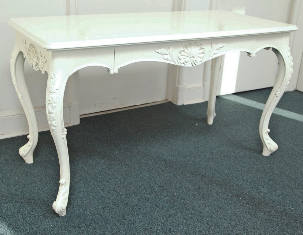Made by Frederick Victoria in 1960 for carpet designer and manufacturer Edward Fields. Table has been refinished in white lacquer recently. 1/4" beige stripe on top. Narrow drawer has a metal slide. Made in the USA circa 1960. Condition: Very Good. 27.5”H x 48”W x 22”D