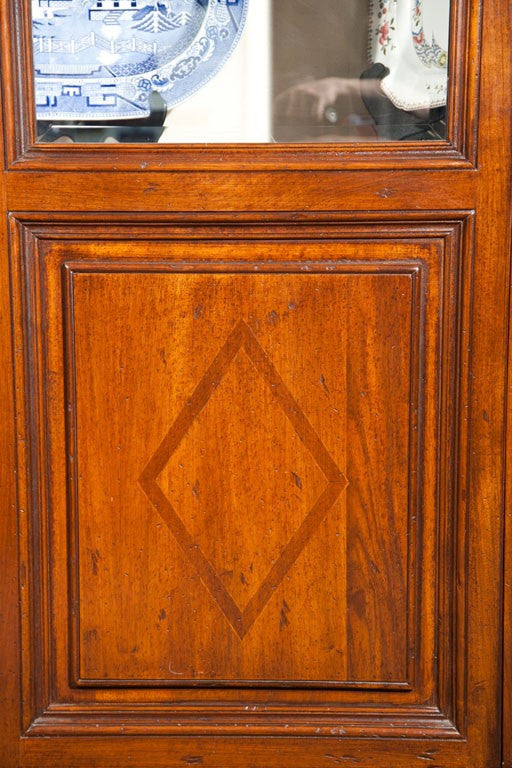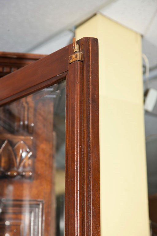 Large walnut wood Italian style reproduction cabinet. Top cornice removable. Beveled clear glass doors. Ratchet side supports for adjustable shelves. Chenille fabric back. Made in Italy in the late 20th Century. Condition: Excellent. 90"H x 64"W x 16"D