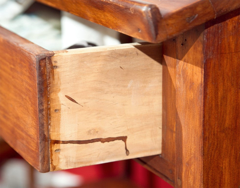 Large standing desk which is a reproduction of a 19th century piece. Made of knotty pine. The desk was produced for a TV series in the 1960's about New England ( USA ). It has two drawers. There is a very small metal knob on top which was probably used for a microphone connection. Condition: Very Good. 60”L x 28”D x 49”H