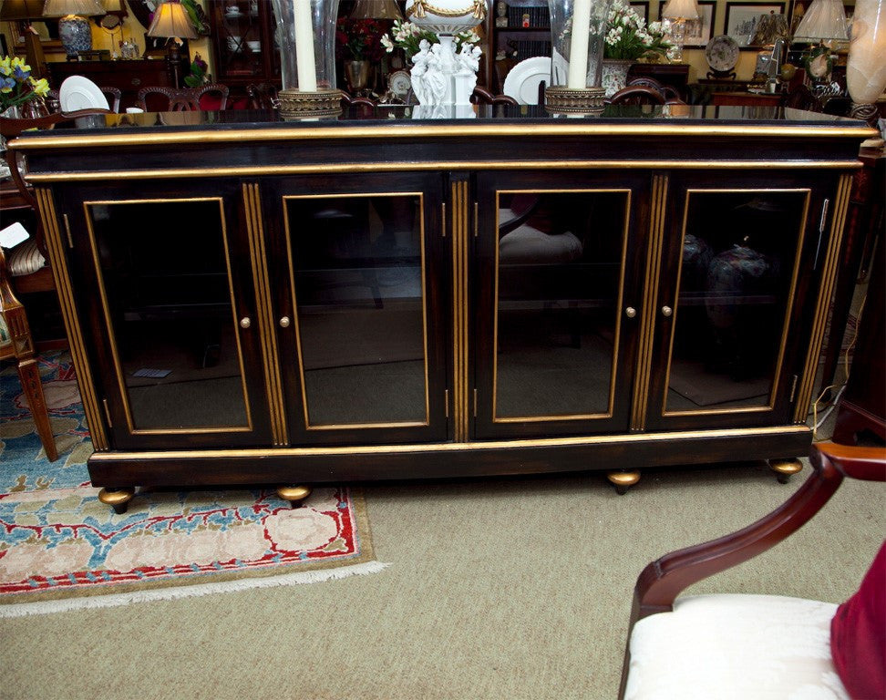 Burnished ebony display cabinet with gilt trim, glass doors, lights inside and glass framed shelves. Interior lights dimmable by touching hinges. Granite top. Condition: New. 39"H x 76"W x 17"D