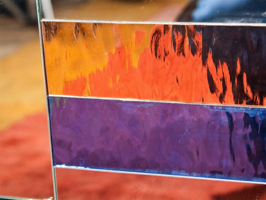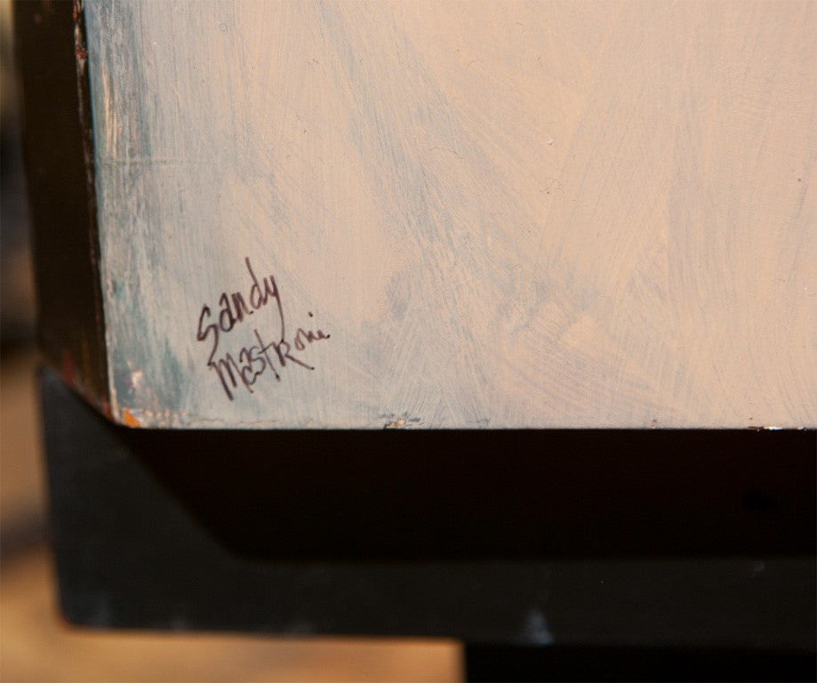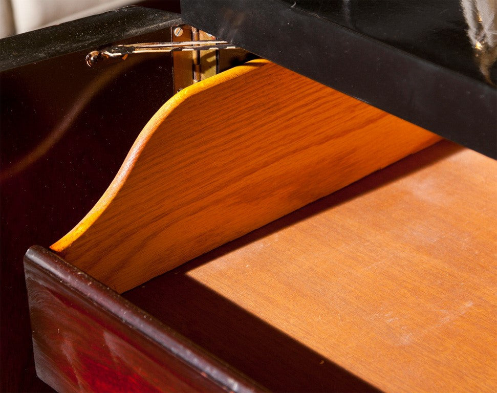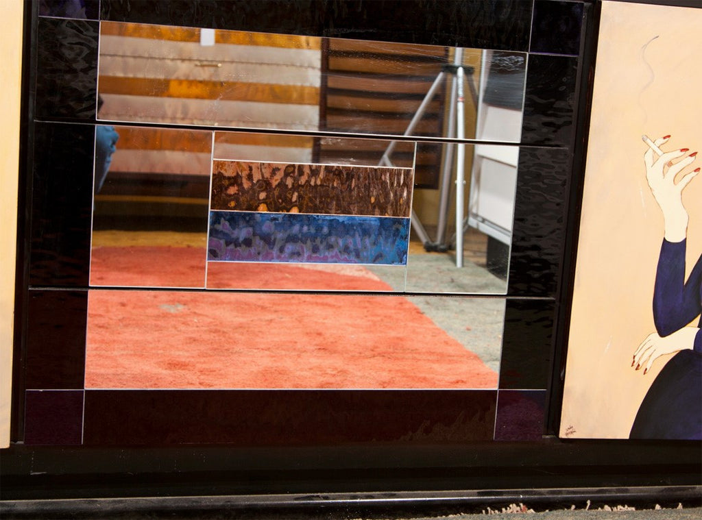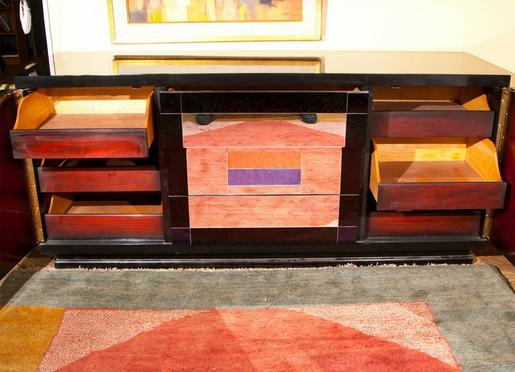Black lacquer dresser with mirror drawers in the middle with applied colored mirrors. Tray drawers behind the doors. Doors are hand painted portraits of women. By Sandy Mastroni, Connecticut artist. Condition: Very Good. Made in the UNITED STATES circa 1980. 32"H x 72"W x 22"D
