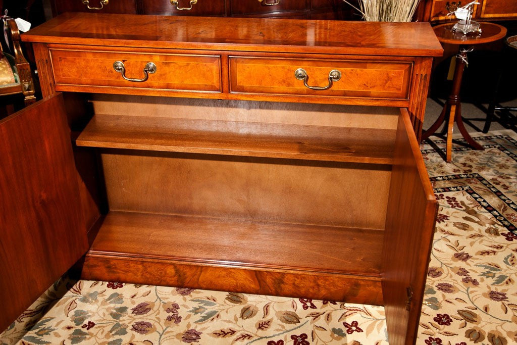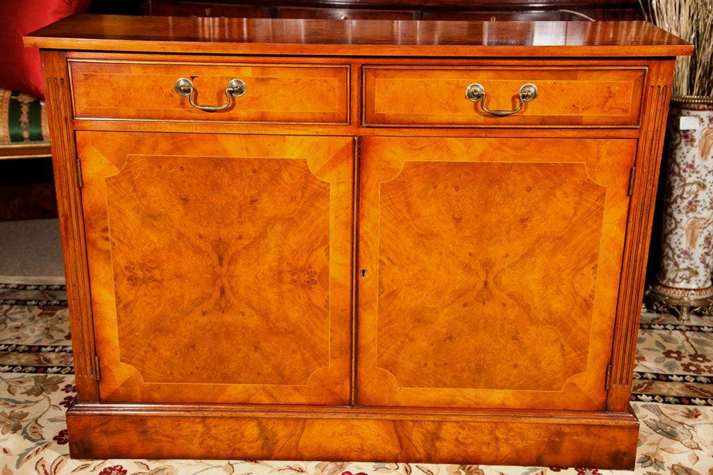 All myrtle wood, inlaid sun burst doors. Two drawers and two doors. Only 11.75" deep. Adjustable shelf behind doors. also available 32"W x 11.75"D x 34.5"H $1895. Made in England. Condition: Excellent. 34.5"H x 11.75"D x 45"W