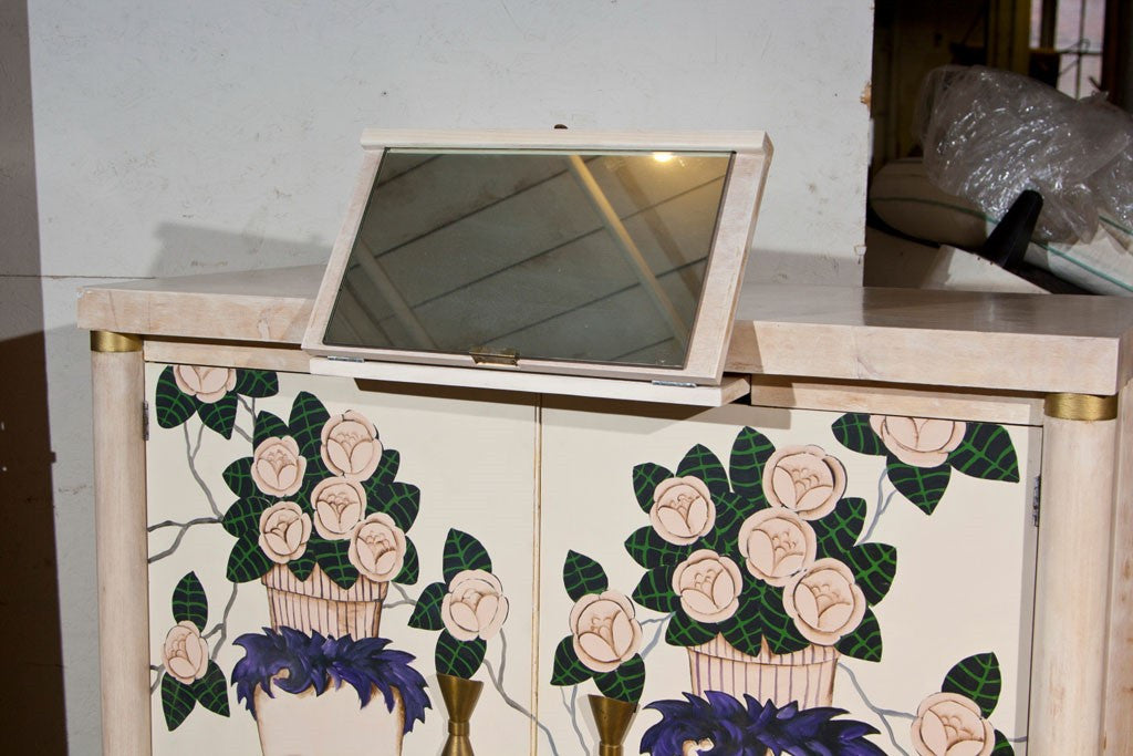 TPOP3 redesigned this Red Lion of Philadelpha chest. Noted artist, Sandy Mastreoni of Connecticut is the artist who painted "the whispers of the red twins." Pullout mirror and 5 tray drawers. A write up on the artist was published in Better Homes And Gardens. Made in the USA circa 1950s. Condition: Good. 49"H x 46"W x 20.5"D