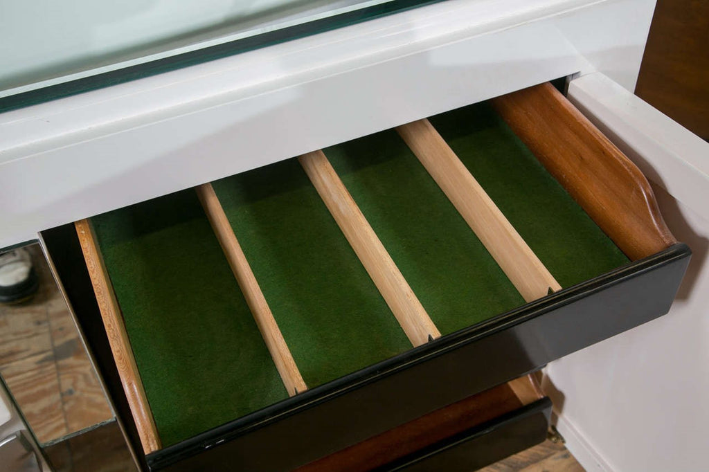 One door has charcoal mirror and one has clear. Half of the pilaster between the doors is charcoal and clear mirror. The top is in the style of Paul Laszlo, that is. half in clear and half in charcoal mirror. . Both with 1" bevel- Four tray drawers behind one door and adjustable shelf behind the other. Made in the United States circa 1950. Condition: Excellent. 34"H x 29"D x 54"W