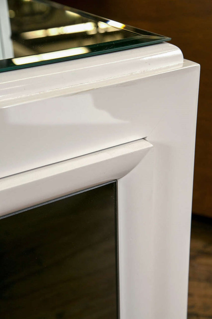 White Lacquered Credenza with Juxtaposing Mirrored Doors and Top