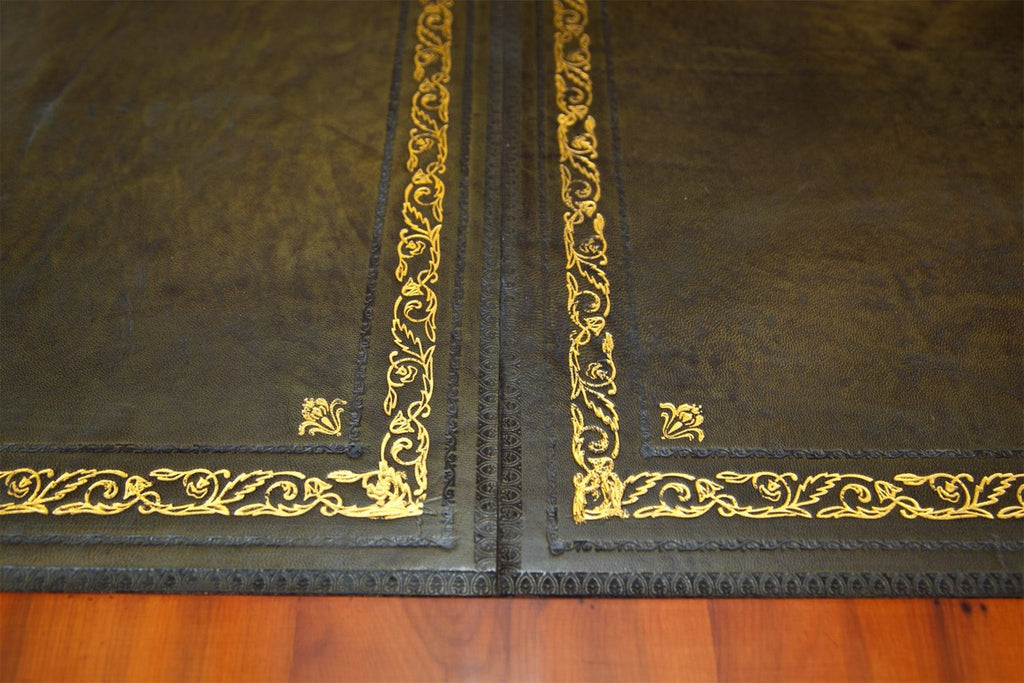 English yew wood partners writing table with green leather top and gold tooling. Six drawers, with three each side. Brass cup and castors. William IV style Made in England circa 1980. Condition: Excellent. 31.5"H x 36"D x 60"W