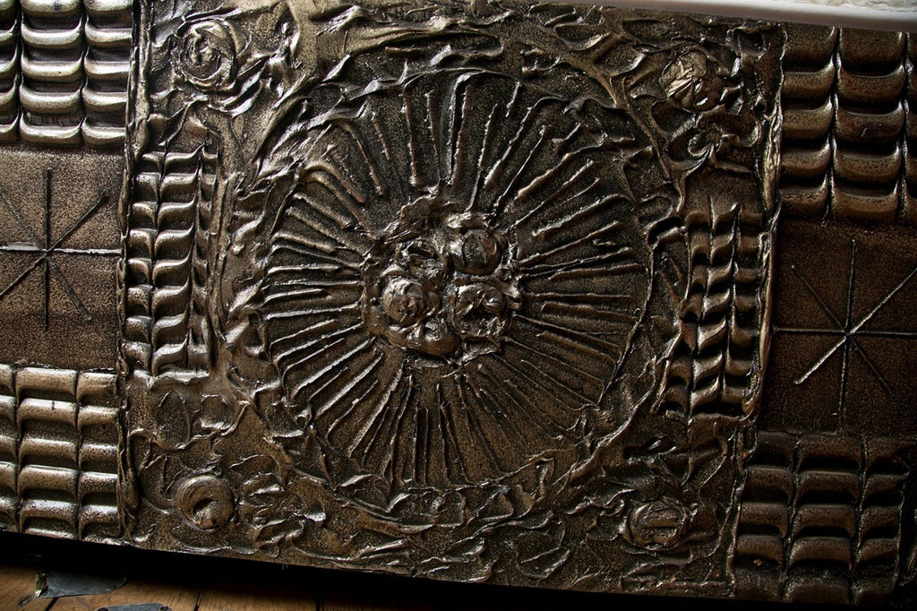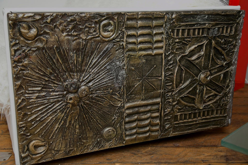 Five foot upholstered loveseat designed by Adrian Pearsall, made by Craft Associates in the style of Paul Evans. Cast resin sides and back panels. Unique design. Upholstered in white naugahyde with faux Mongolian Fur pillows. Recently reupholstered. Made in the USA circa 1970. Condition: Excellent. 26"H x 36"D x 60"L, S/H: 16"
