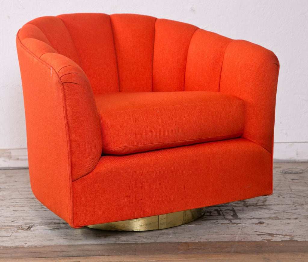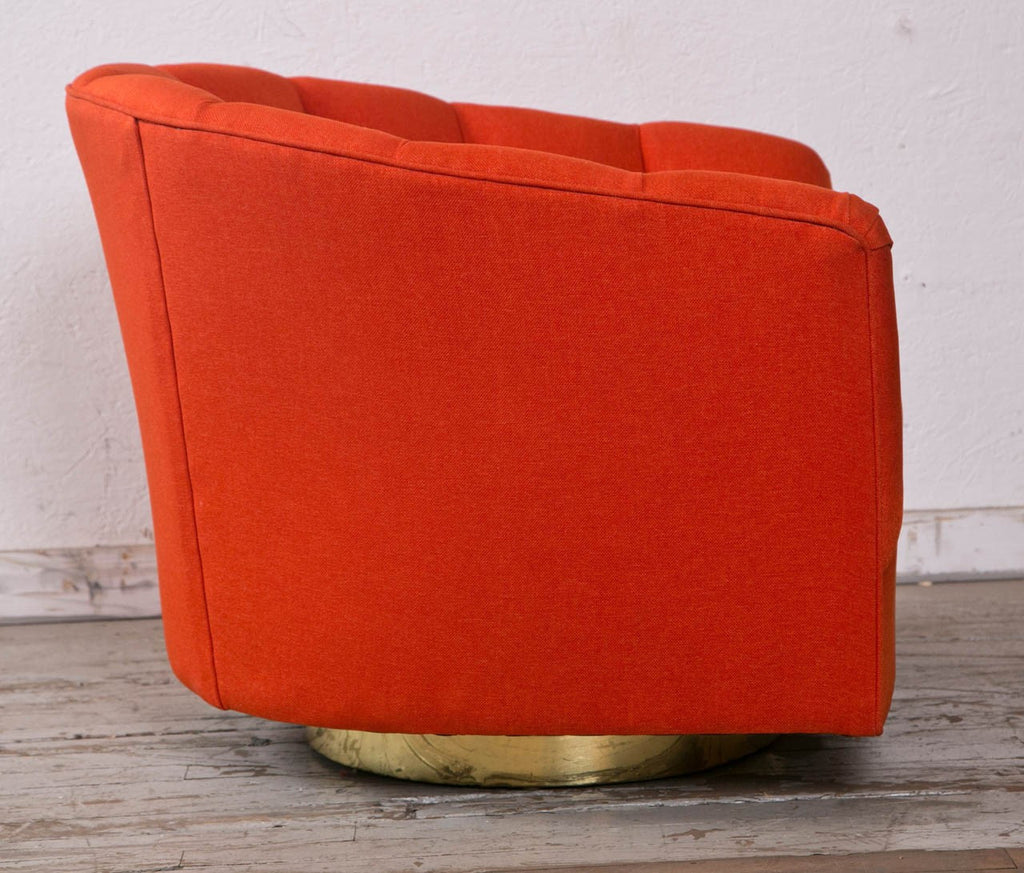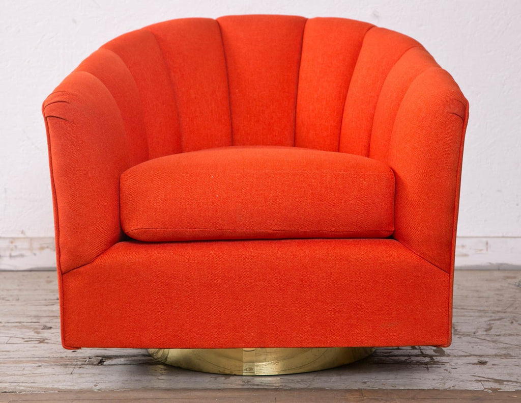 Mid Century swivel chairs designed in the style of Milo Baughman. Completely restored in orange cotton fabric. Made in the USA circa 1955. Condition: Excellent. 27"H x 30"D x 30"W, S/H:16"