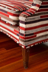 Recently reupholstered in a fine multi colored striped chenille. Mahogany legs with box wood inlay. 32"H x 87"W x 34"D, 18"SH, 24"ht arm. Made in England circa 1915. Condition: Excellent.