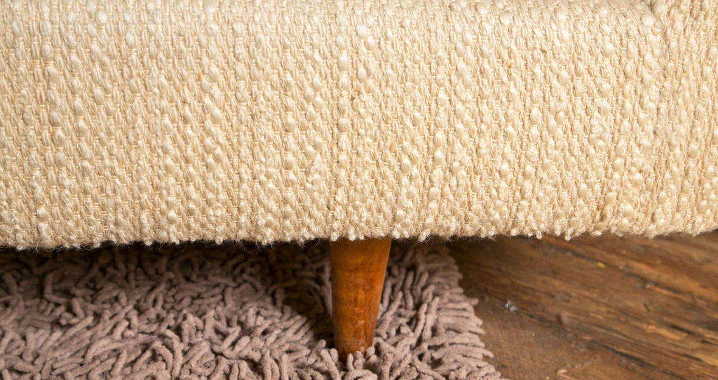 Three sets of Maple stained wood legs hold this iconic sofa in place. The sofa is offered "as is." Haitian Cotton is worn and torn. Sofa has coil springs and firm pillows. Arm height 23" Sofa has a great provenance: it comes from an Ulrich Franzen designed house in Essex, Connecticut, USA. Made in the United States circa 1952. Condition: Fair. 39"H x 29"D x 84"W, S/H: 18"
