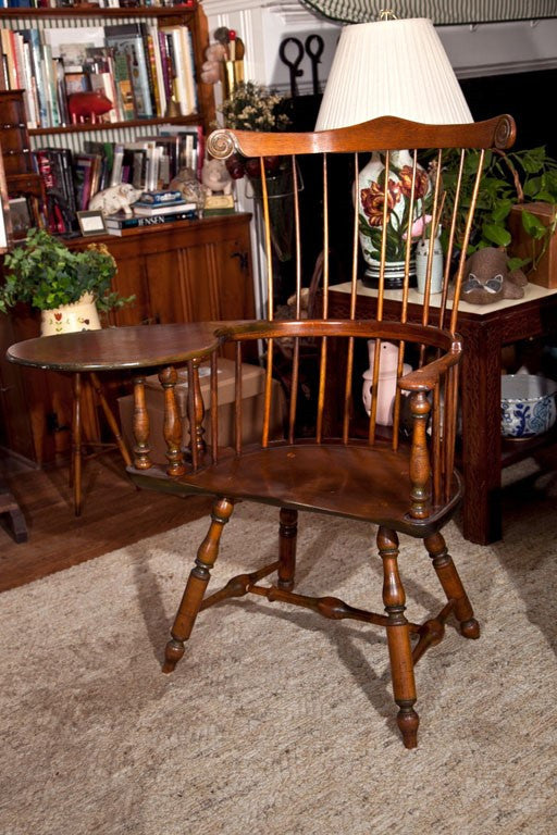 Windsor chair used by gentlemen for studies, all assembled with dowels. Bent ash wood with cherrywood table. The same type used by the Continental Congress in 1776 when creating the Declaration of Independence. Made in the USA in the 1920s. Condition: Good. 34”L x 33”D x 45”H
