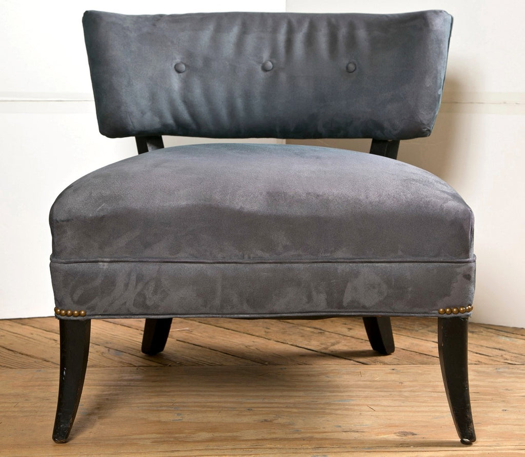 The ebonized legs on this chair are flared or tapered while the upholstery is a gunmetal micro-suede. Recently recovered. There are nickel nail heads above the legs. The spring construction verifies the 1940's time frame. Coiled sprung with burlap straps for support. Made in the United States Circa 1946. Condition: Excellent. 28"H x 27"W x 21"D, S/H 16"