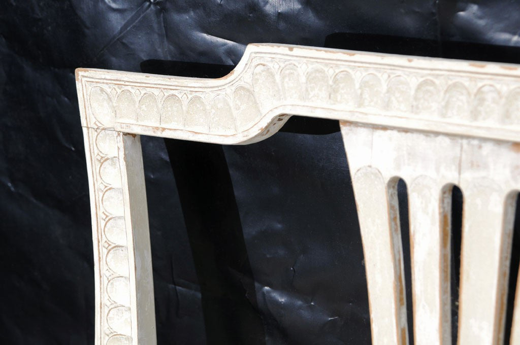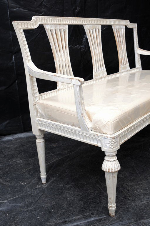 Antique settee. Birch wood with off-white milk paint, all hand carving. Gustavian Style. Recovered in white muslin. Made in Sweden circa 1920. Condition: Very Good - age appropriate. 38"H x 65"W x 25"D, S/H: 19"