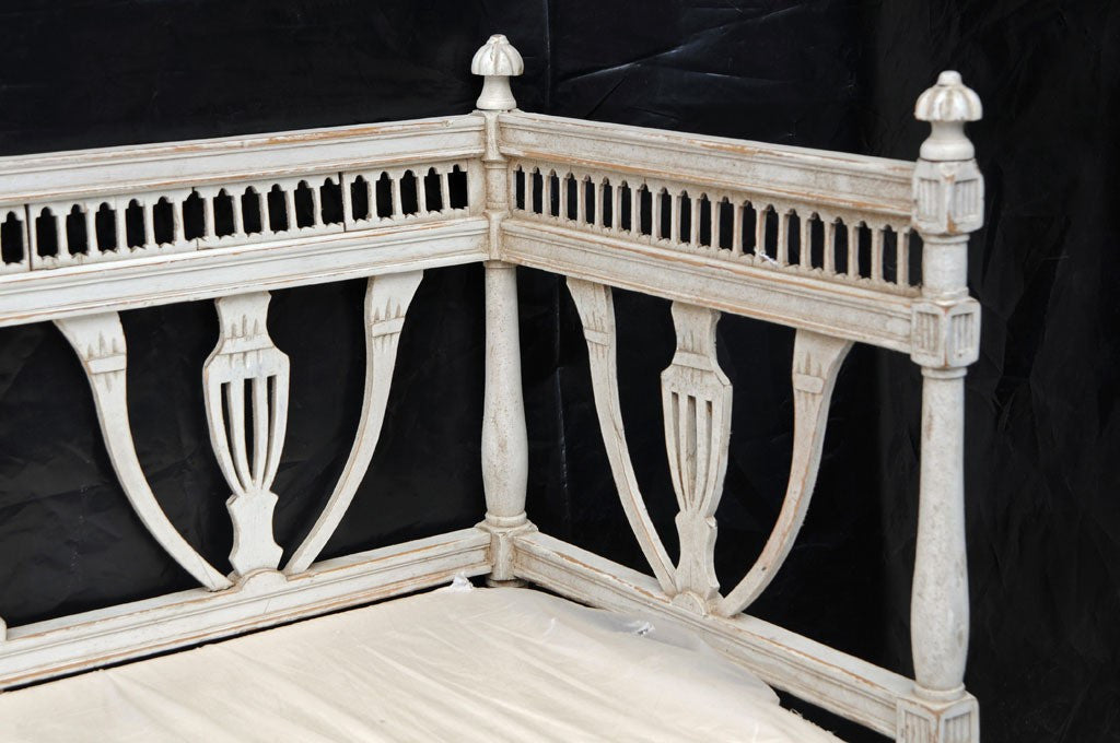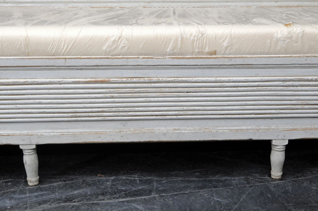 Antique hand-carved wood sofa. Gustavian. Reupholstered seat in white muslin, milk paint finish in off white. Made in Sweden circa 1830. Birch wood frame. Condition: Very Good - age appropriate. 37"H x 80"W x 24"D, S/H: 19"
