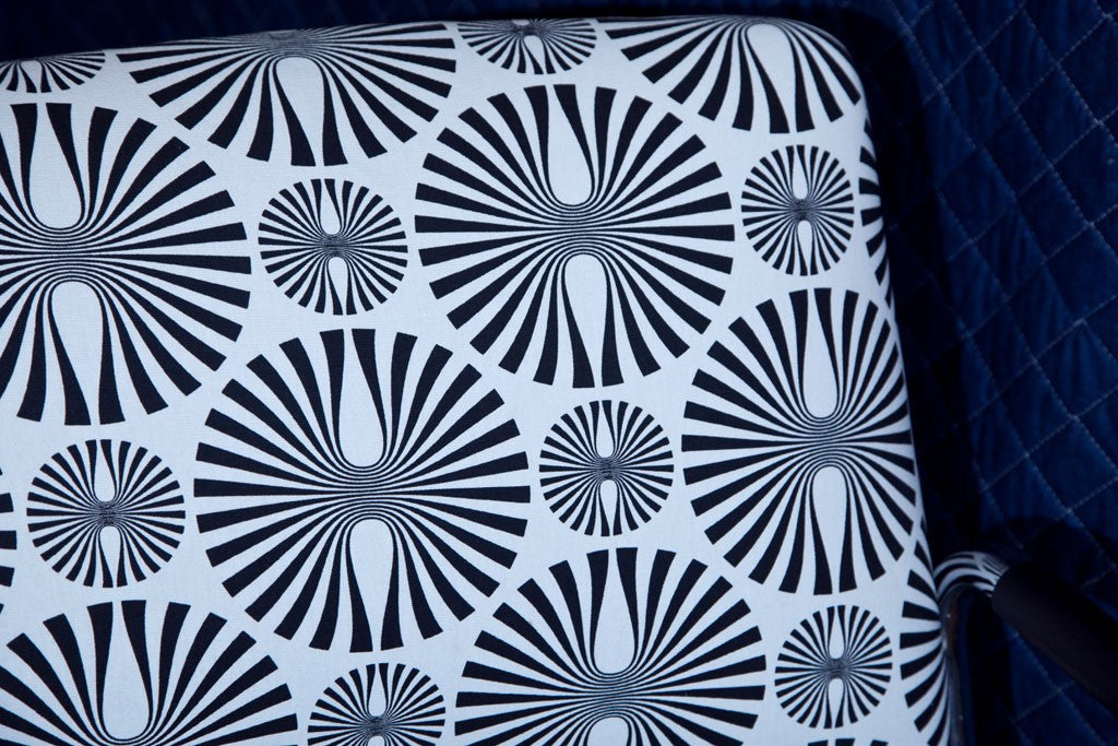 Mid-century chrome chairs by Steelcase. Bakerlite arm rests. Black finish. We have 10 chairs available ( 5 pairs ). Chairs are price in pairs. Black and white print upholstery. Made in USA circa 1970. Condition: Good. 33"H x 24"W x 21"D, S/H: 25"