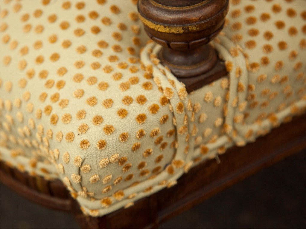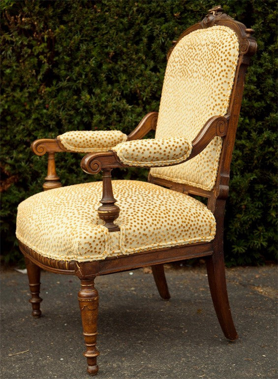 A pair of 19th century French Napoleon III style chairs featuring a detailed crest consisting of a heraldic shield, surrounded by acanthus leaves and all gilted trim. Recovered. Made in France circa 1880. Mahogany wood. Condition: Good. 39"H x 24"W x 20"D