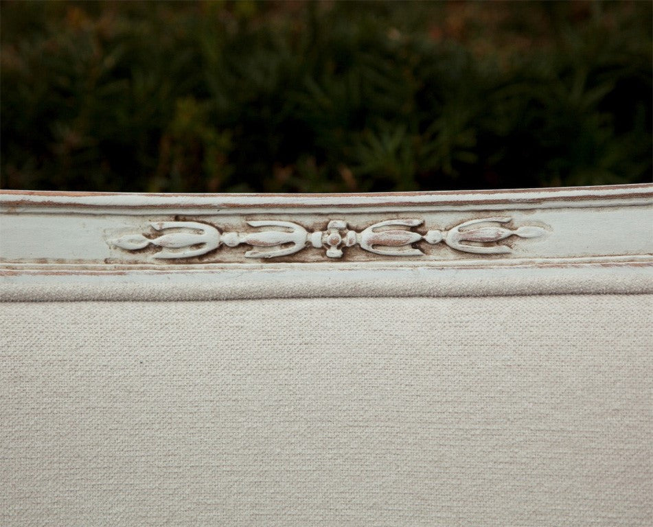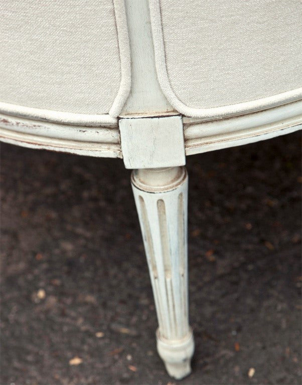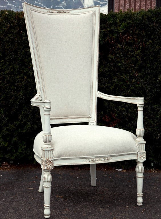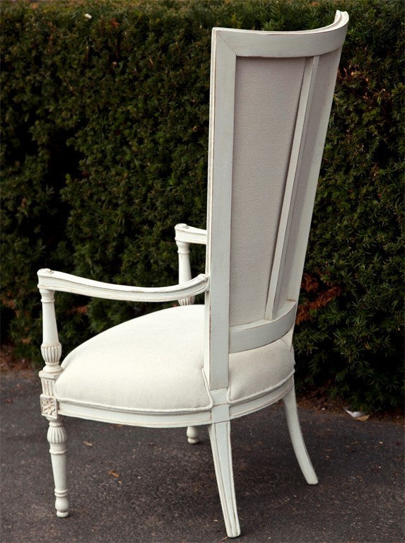 A rare pair of Gustavian armchairs called King Kolar Chairs. Restored with oyster milk paint. Recovered. Made in Sweden circa 1905. Condition: Good. Beech wood frame. 48"H x 25"W x 23"D