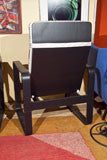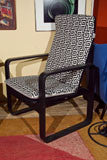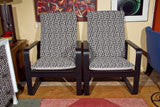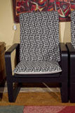 BLACK LACQUER PAIR OF CHAIRS- DESIGNED BY MICHAEL THONET- COVERED IN BLACK & WHITE GREEK KEY TAPESTRY. SOLID BLACK BACK WITH WHITE HORIZONTAL STRIPE. Frame made in the USA in the 1940s. Condition: Very Good. 40.25"H x 26.5"W x 24"D