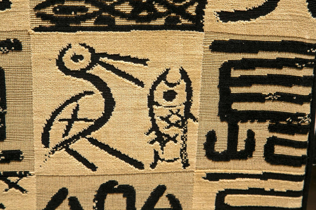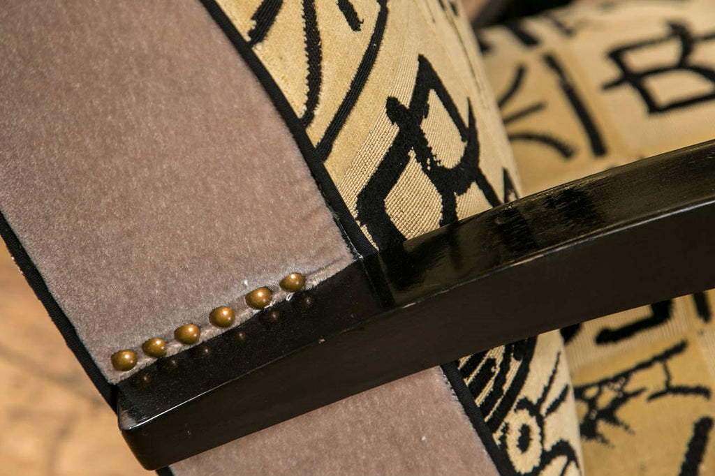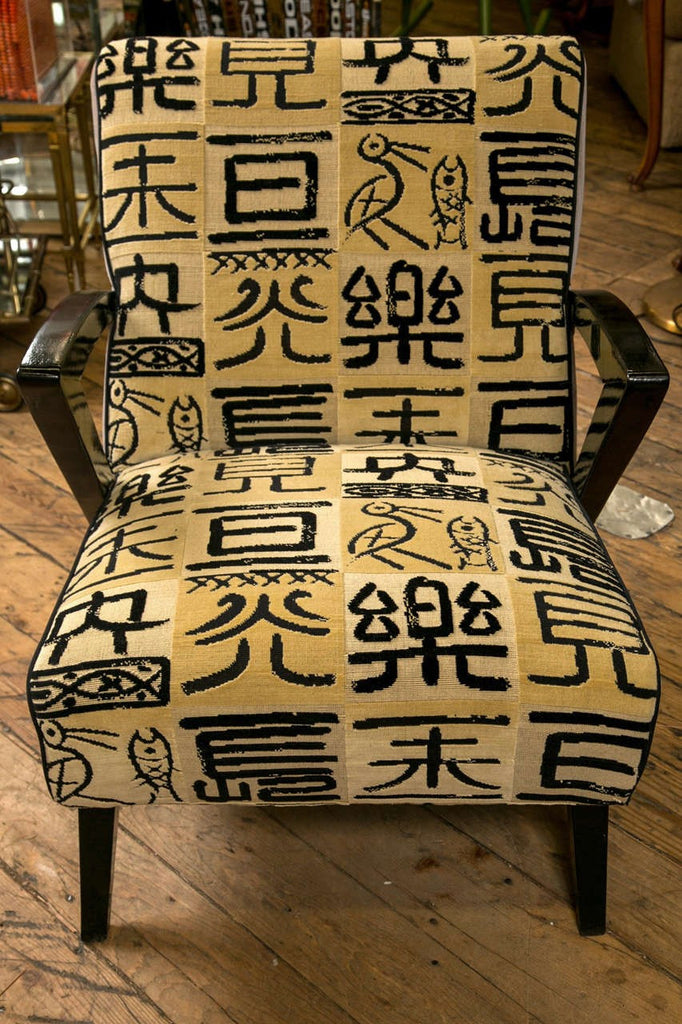 Pair of lounge chairs with open arms. In the series "The Sopranos," the chairs were used by Dr. Melfi, Tony Soprano's psychiatrist ( "shrink" ), for her patients. The chair trim is an extremely muted plum color which borders on grey. It compliments the muted khaki and black chenille print with asian symbols on it. It is always good to see a Cormorant and a fish side by side... the only thing that is missing is the fisherman. These chair frames were made in the 1950's and are in good condition. Black lacquer arms and legs. These chairs have been reupholstered recently. Made in the United States circa 1950. 37"H x 35"D x 26"W, S/H: 16"